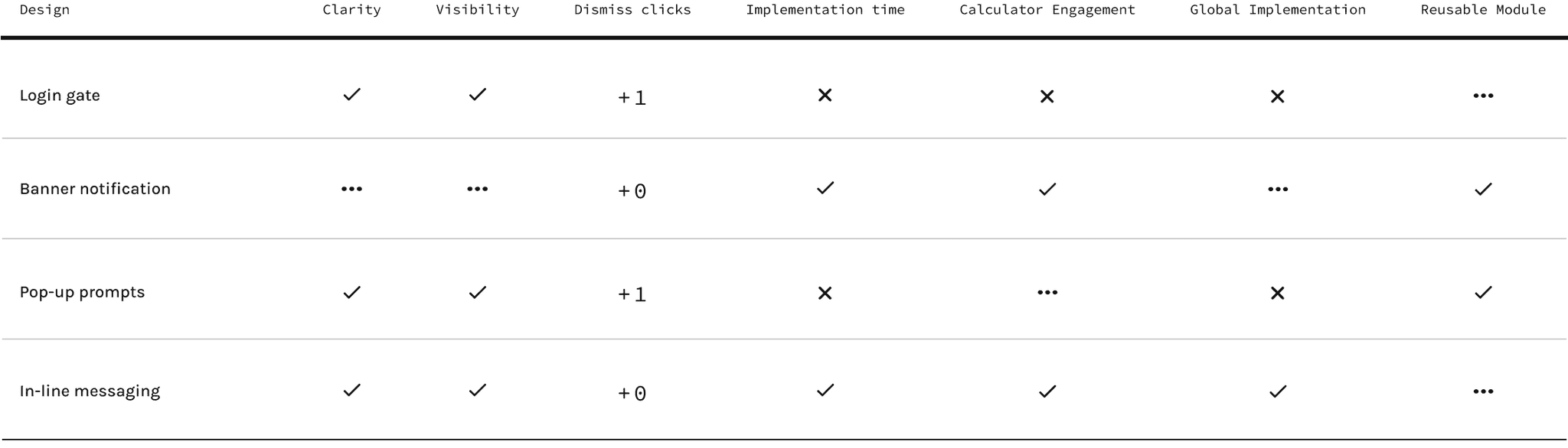 From this, I created six design options: dedicated page, pop-up module, hero takeover, top-of-page banner, inline notification, and navigation hint.