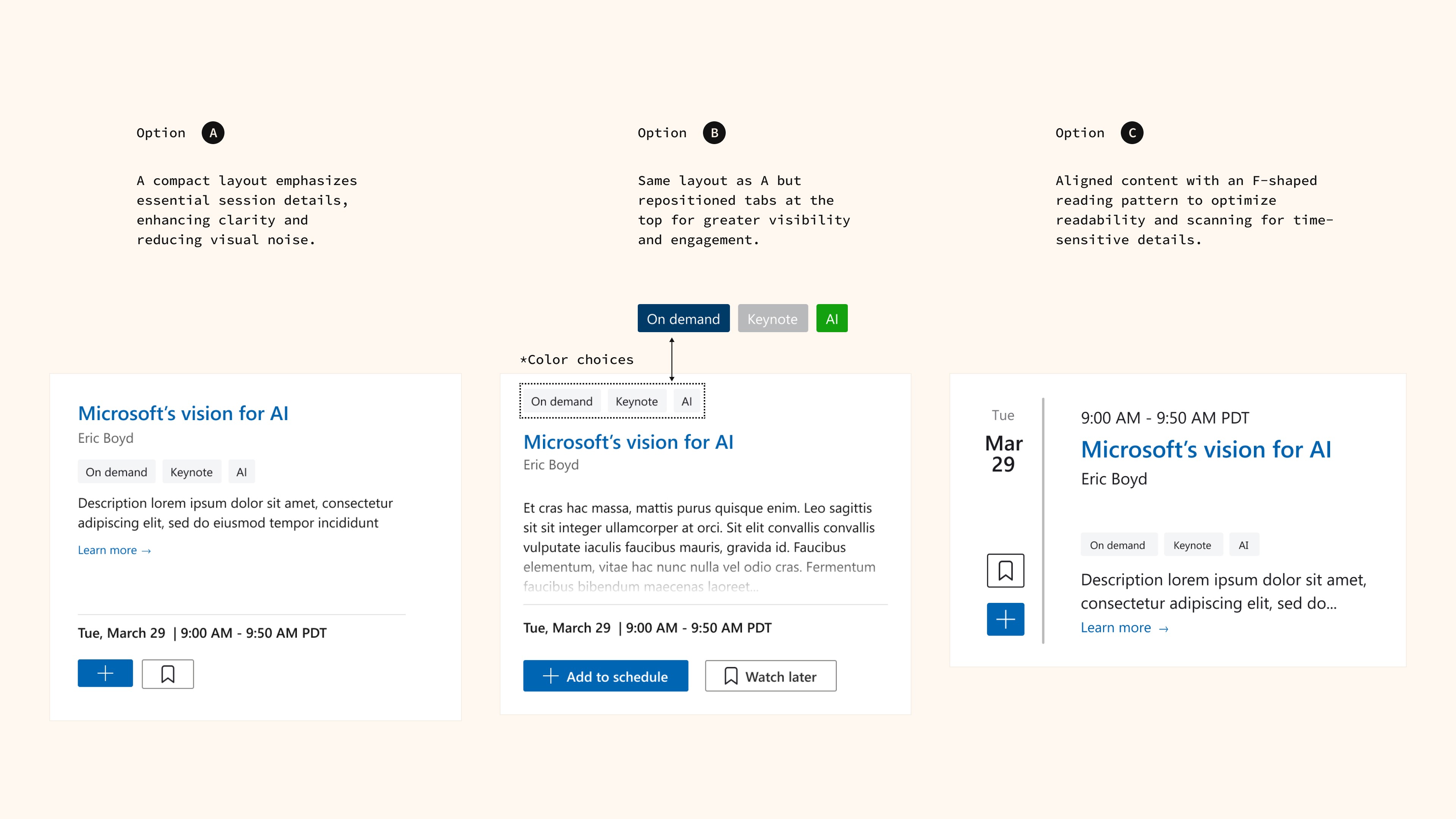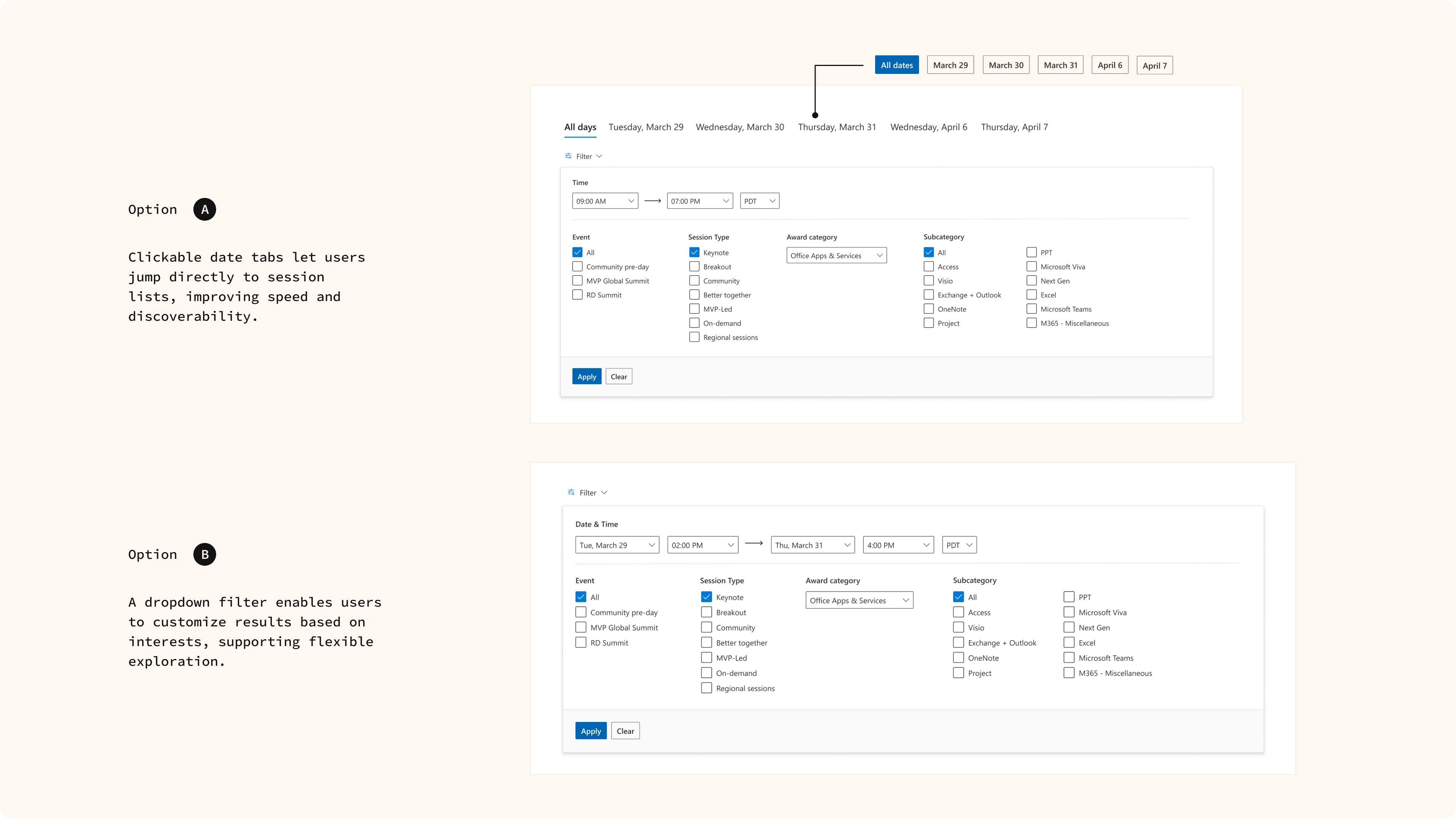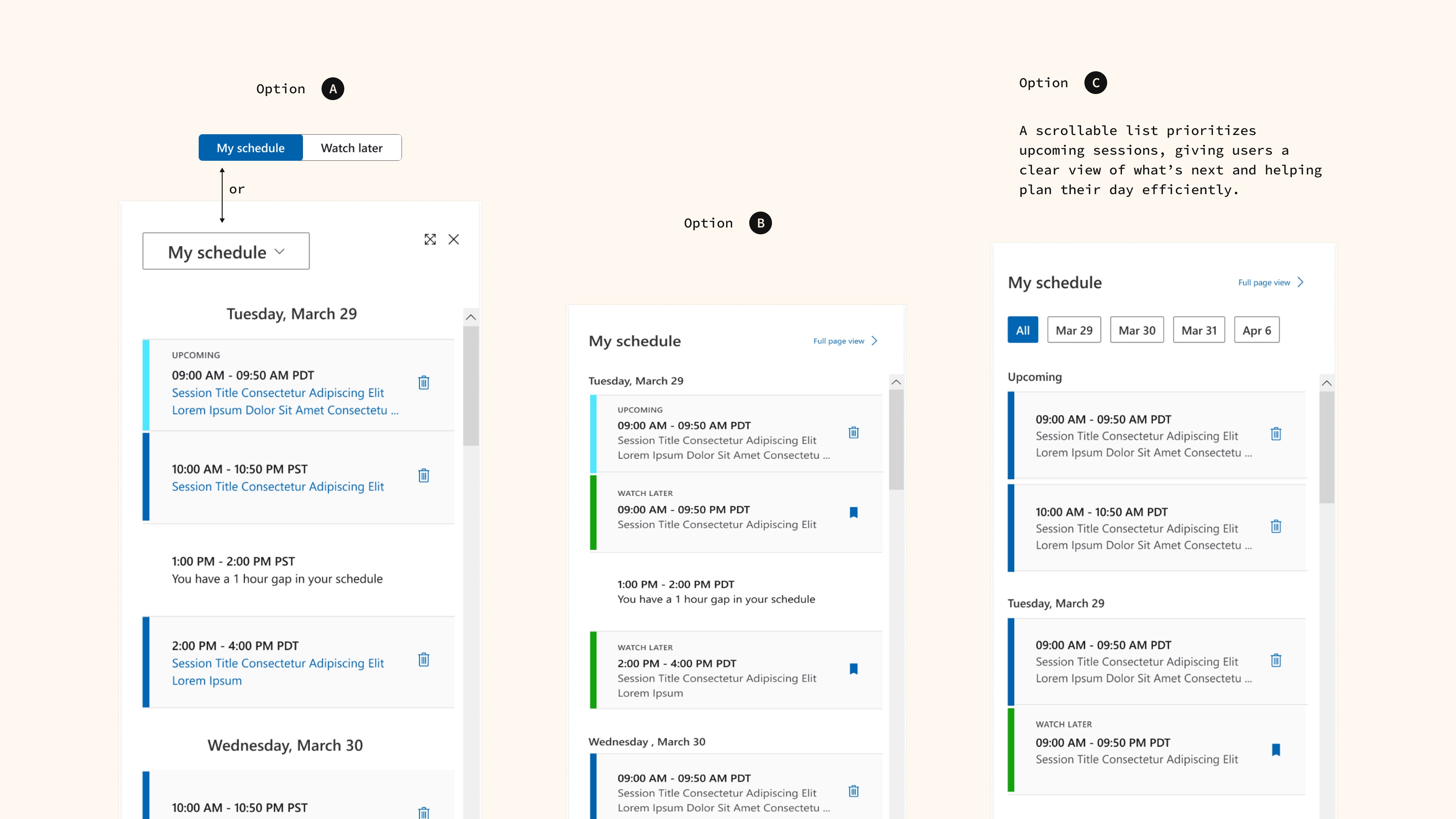 After exploring variations for filters, tabs, and schedule layouts, I brought the designs into team reviews.