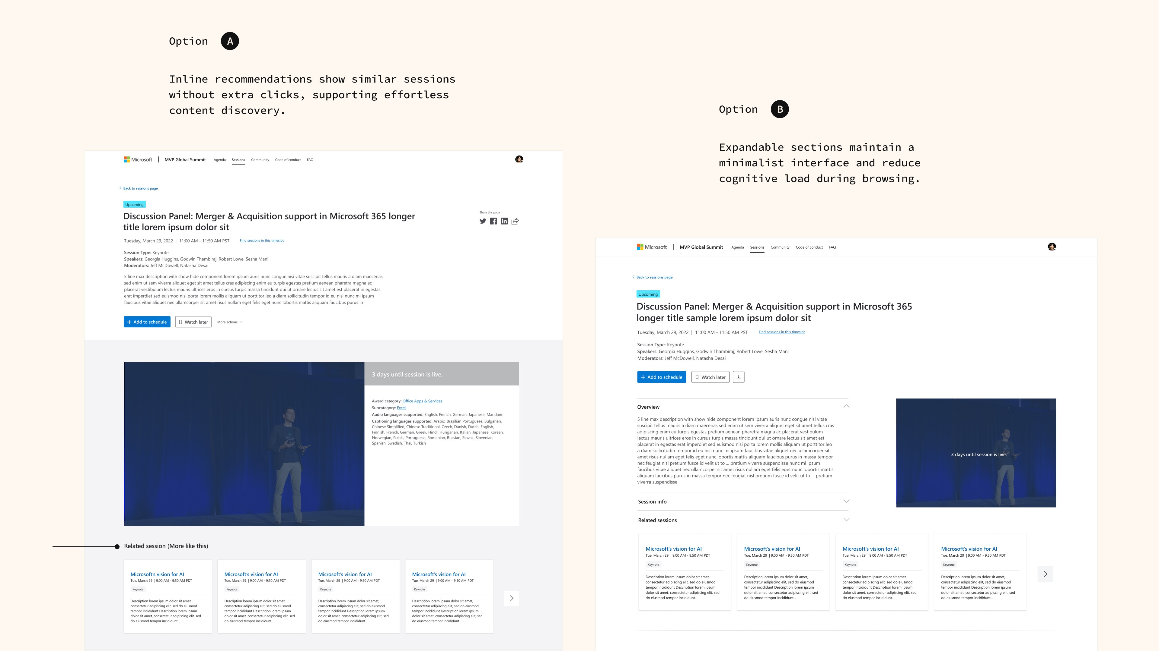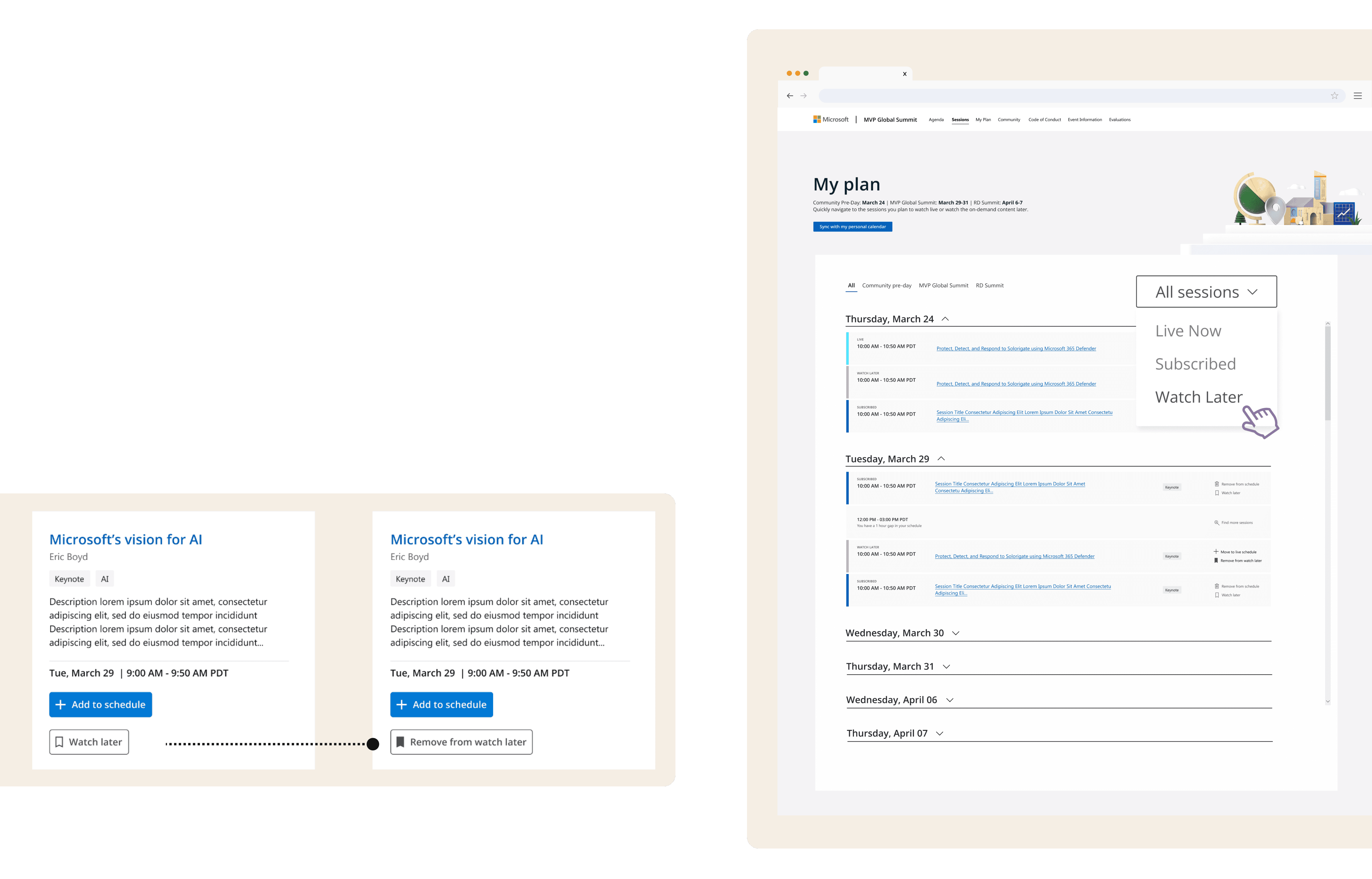 As the lead product designer, I optimized the planning journey to improve discovery, decision-making, and schedule management. I led UX UI design strategy and collaborated closely with PO, engineering, and event teams to boosted pre-event planning by 43%, saved 10K+ sessions with Watch Later, and achieved a 95% satisfaction rate.