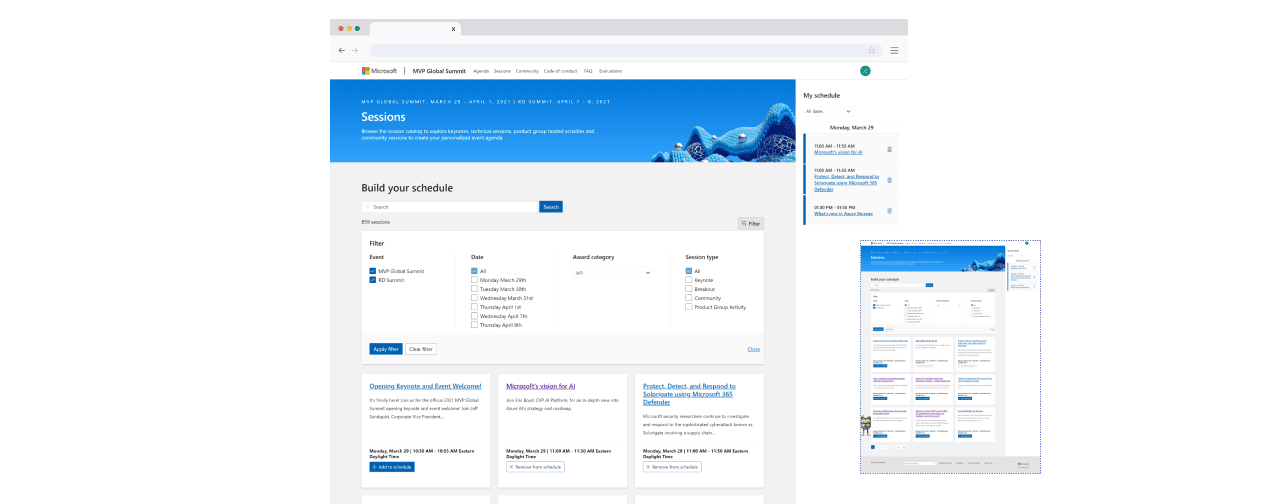 Schedule builder is an event planning tool for Microsoft annual conference, MVP & RD Summit. It helps users to plan and manage their schedule for the event.