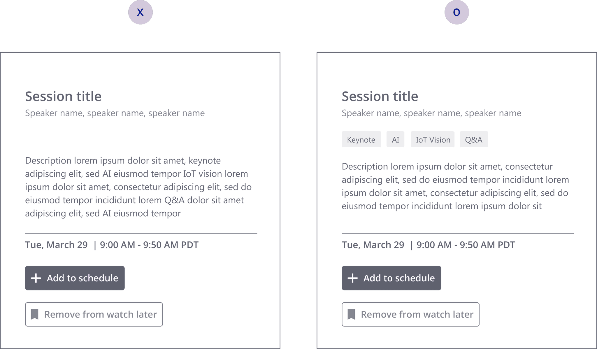 Based on previous years, many speakers couldn’t confirm session details before the conference started, making it impossible to make the tabs clickable. However, I still recommended keeping them, muting the colors to maintain their scan-friendly benefits.