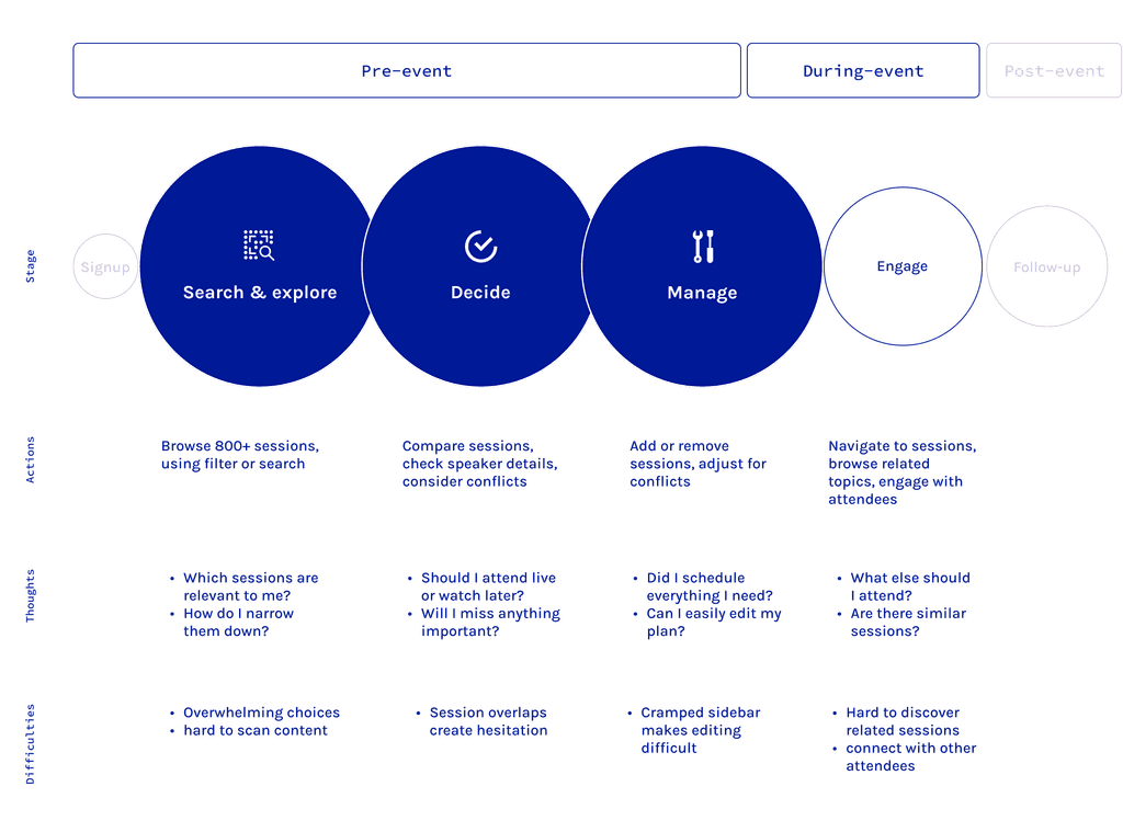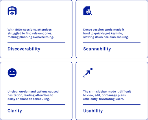 My first priority was to identify why attendees struggled with planning. I analyzed the existing product, reviewed past survey data, and gathered insights from previous attendees.