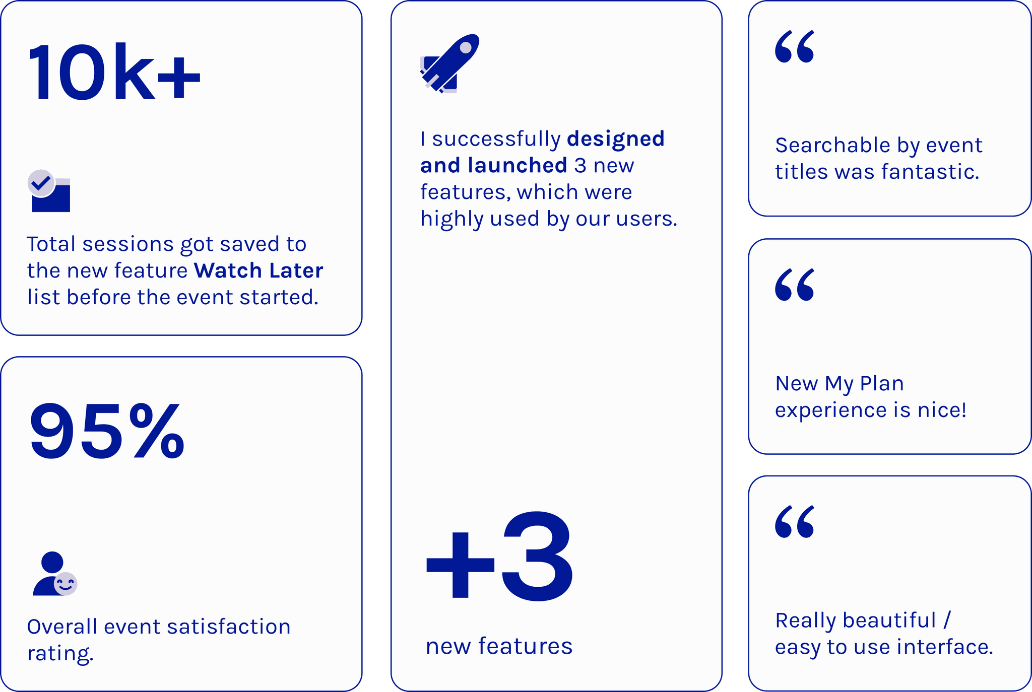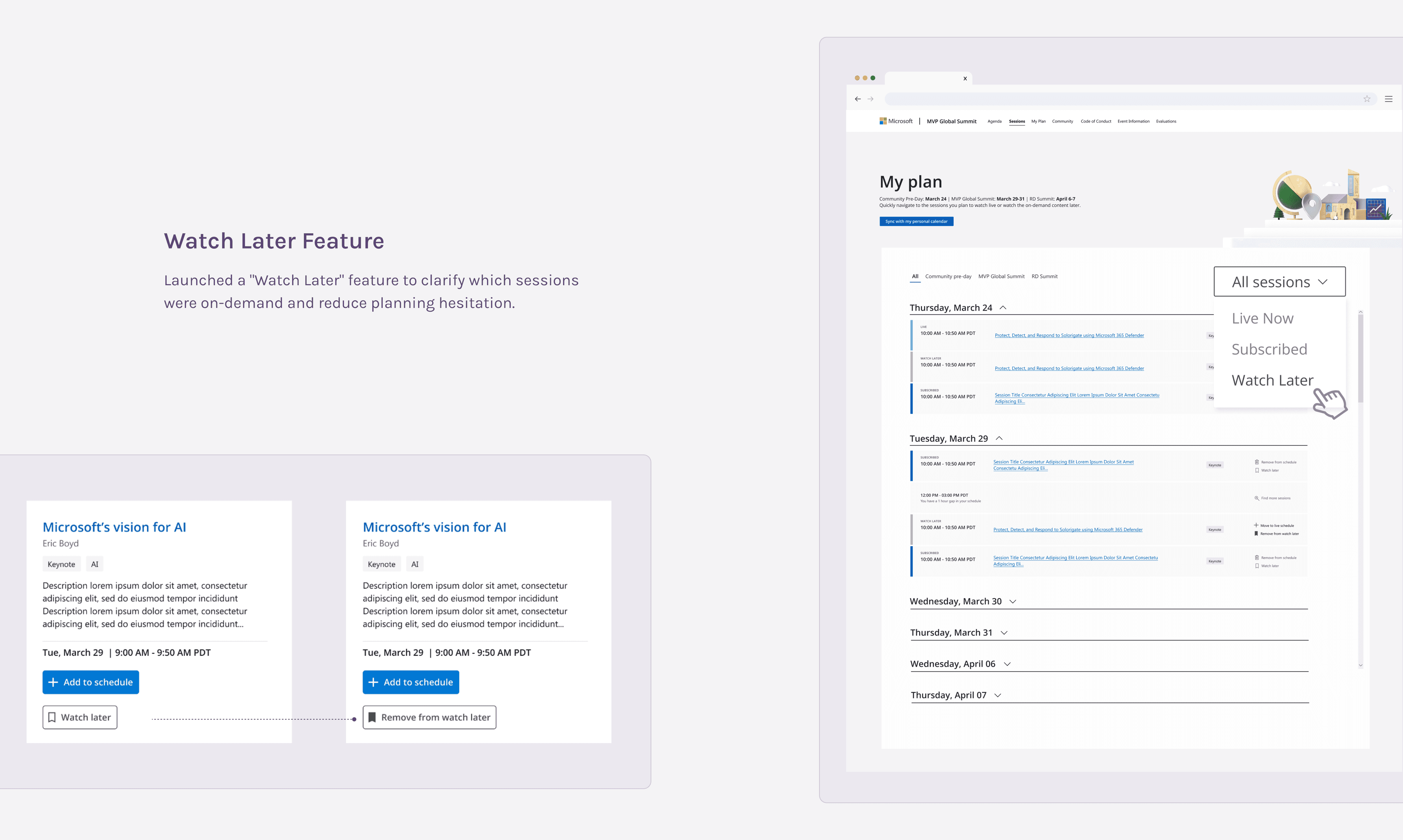 Successfully launched 3 brand new features: event title filters, a "Watch Later" button and list, and a full-screen view of "My Plan" page. Data shows these features are highly utilized by attendees and have received positive feedback in evaluation forms.