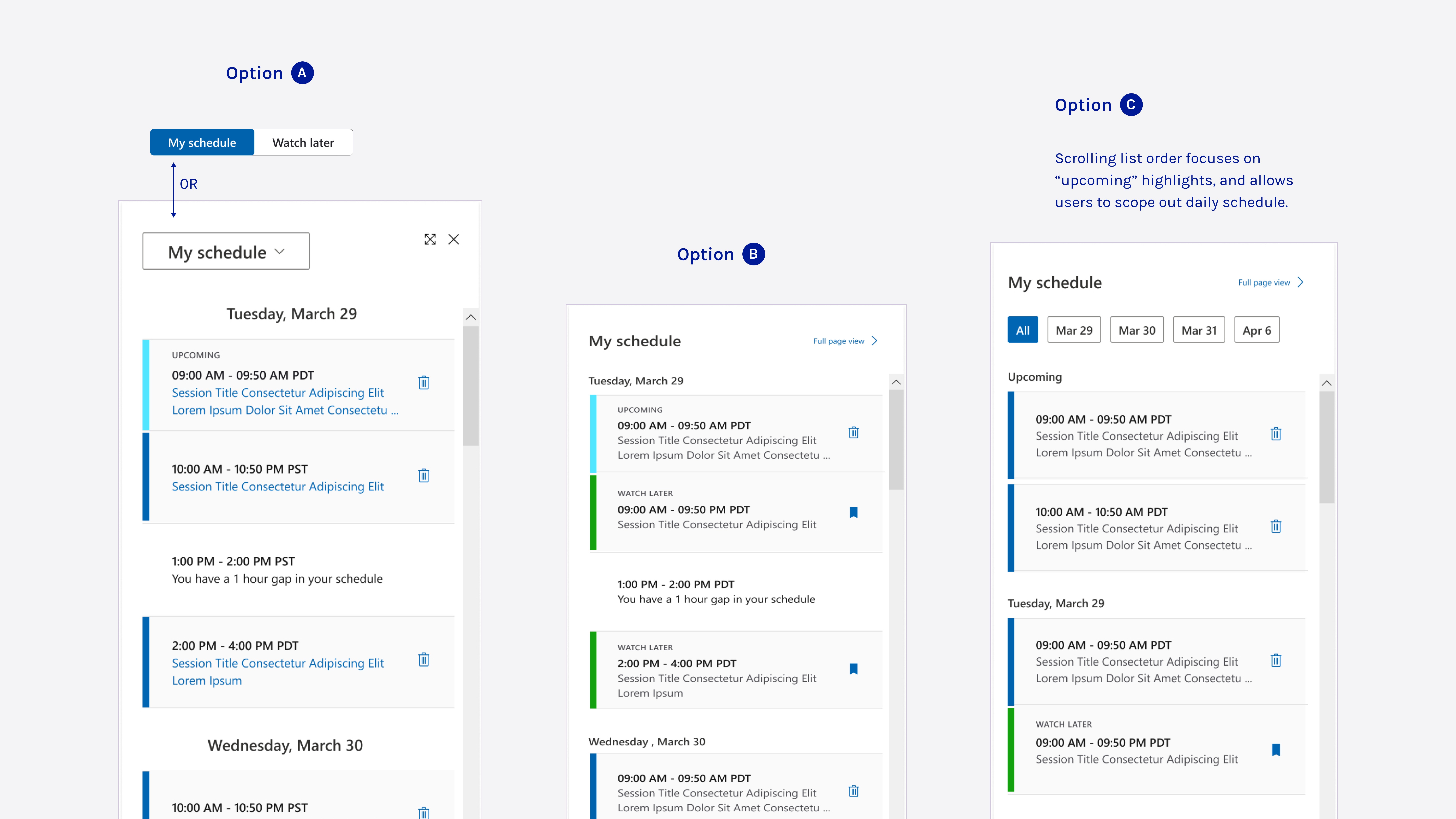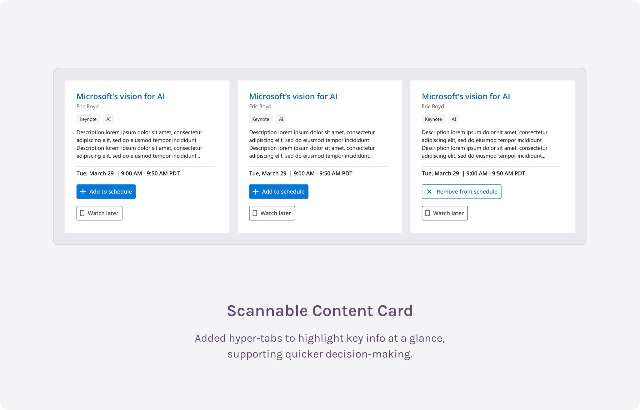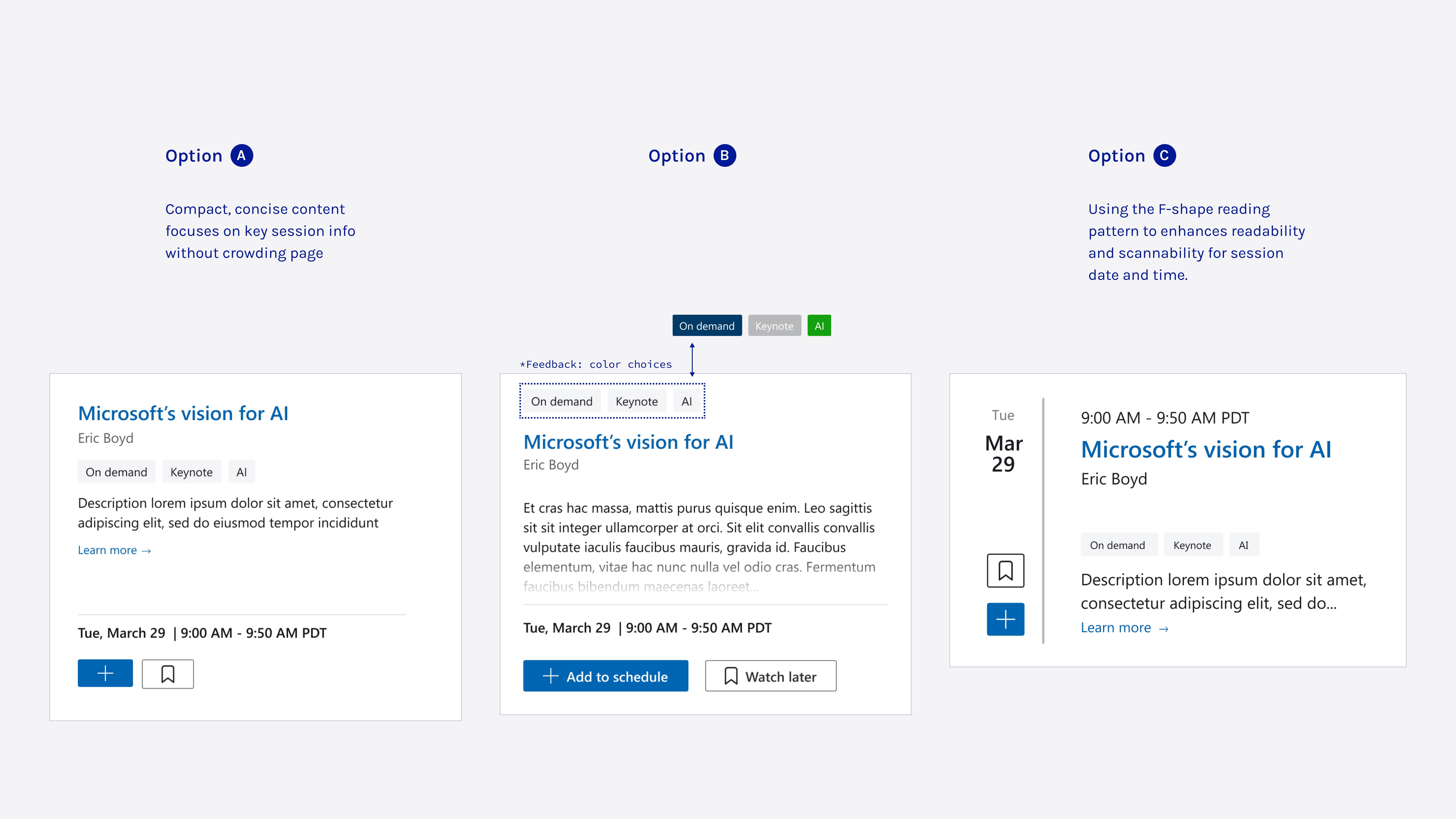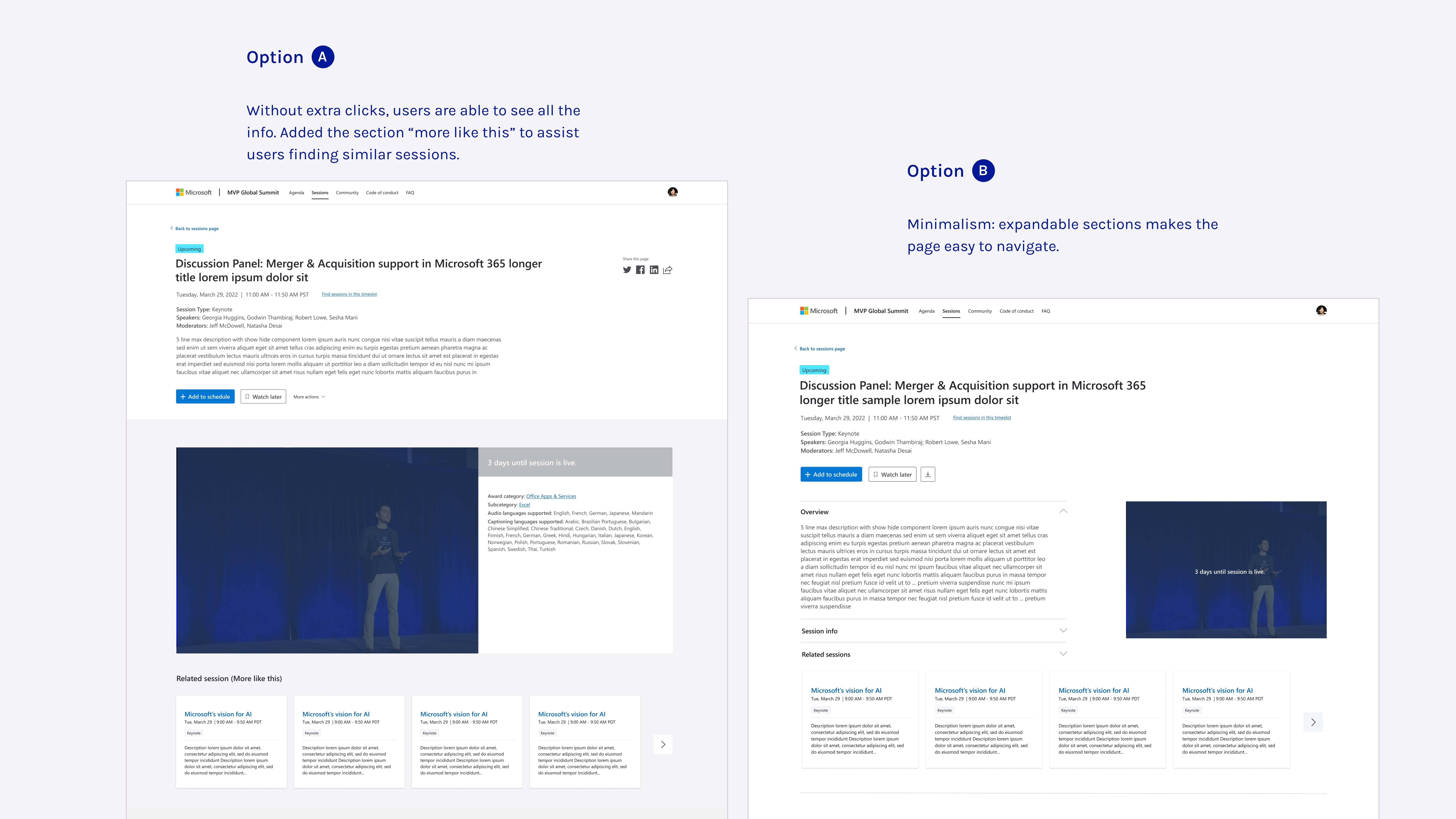 Based on previous years, many speakers couldn’t confirm session details before the conference started, making it impossible to make the tabs clickable. However, I still recommended keeping them, muting the colors to maintain their scan-friendly benefits.