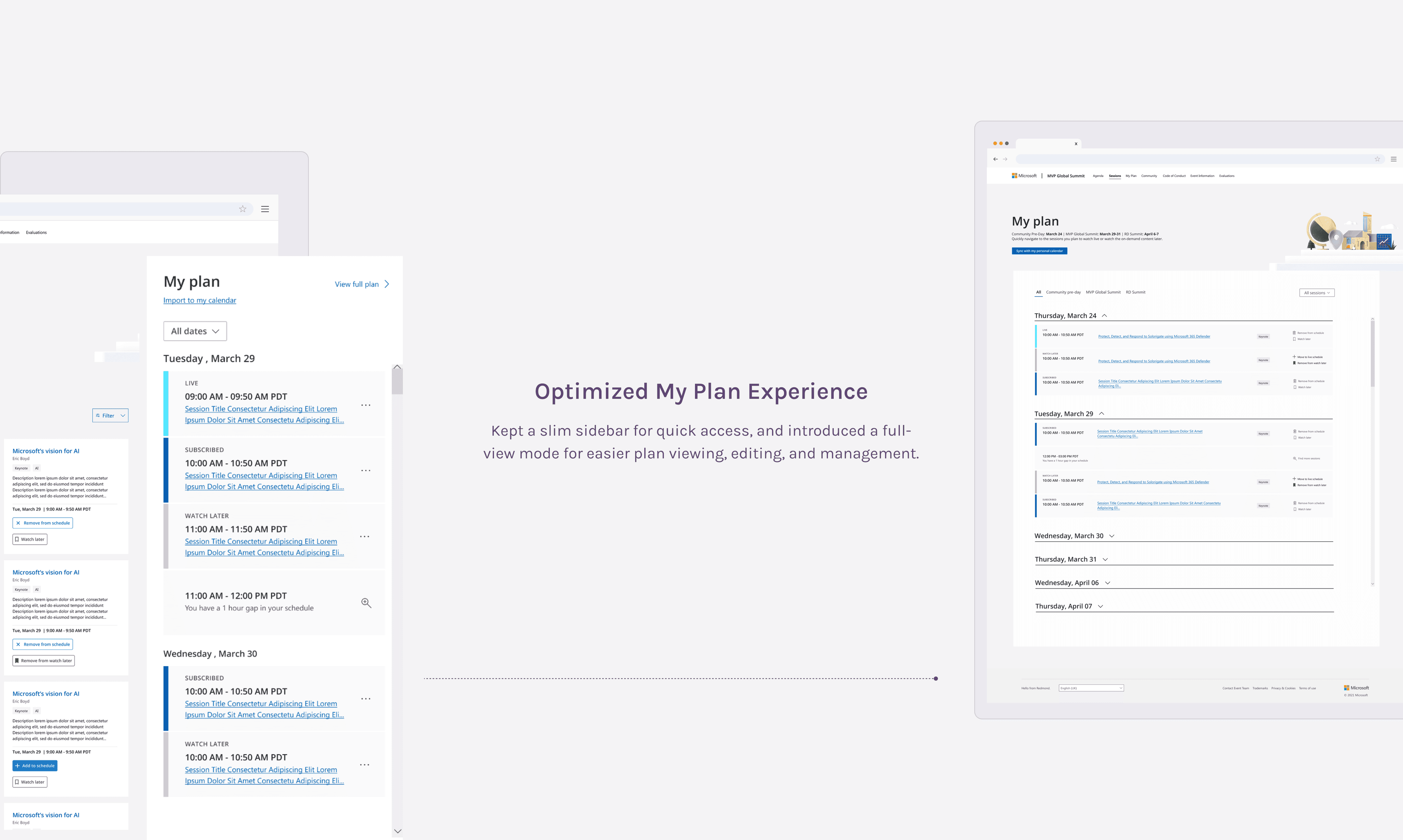To better assist users, I proposed replacing the sidebar planner with a full-screen "My Plan" view. Stakeholders valued the sidebar for quick browsing of scheduled sessions, so they weren’t on board with replacing it.