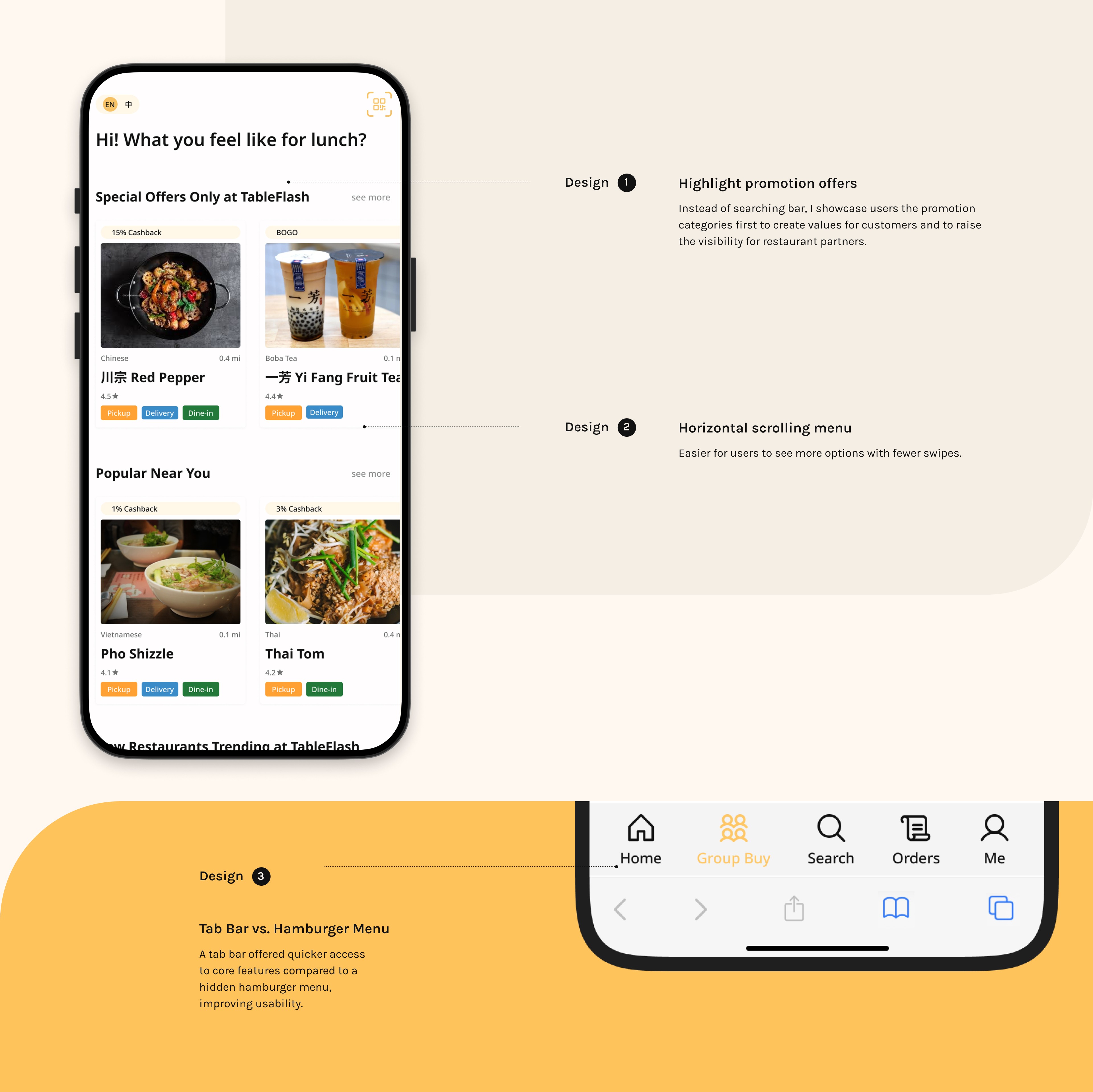 As a Product Designer at TableFlash, I focused on user acquisition. I designed a bilingual web app with clear ordering flows and growth features, collaborating with the founders and PM to support small restaurants, resulting in 617% user sign-up and 20% boost in merchant adoption post-launch..
